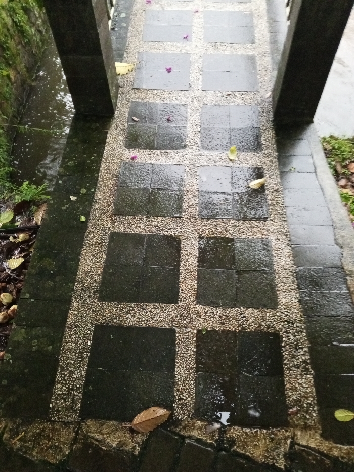 A wet walkway consists of dark, square tiles separated by light-colored gravel. Water reflects off the tiles, indicating recent rain. Some fallen leaves are scattered across the surface, including one large brown leaf in the foreground. The walkway is flanked by a small canal on one side and a raised edge with greenery on the other. Two stone pillars frame the view of the path.