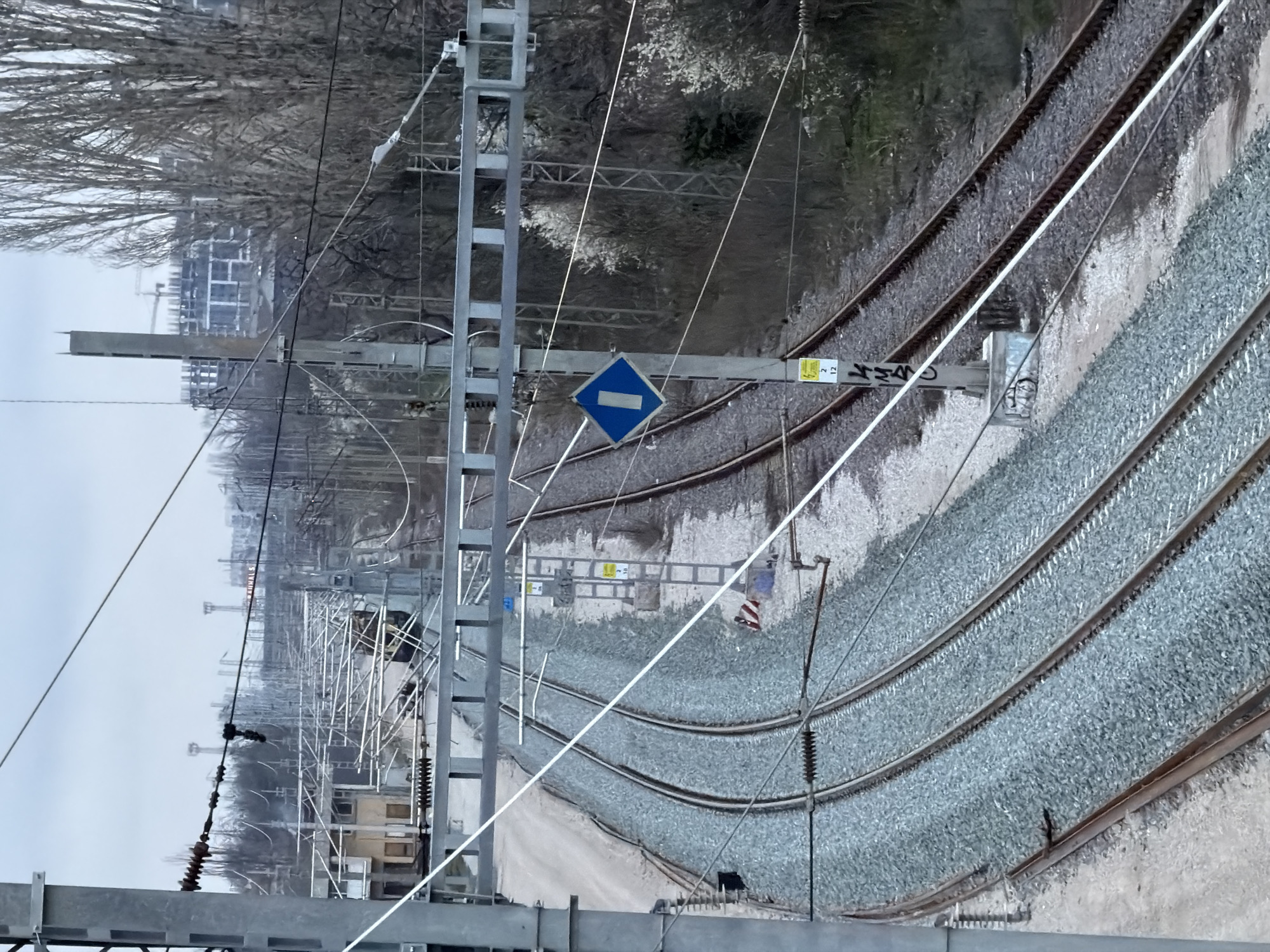 The image depicts a section of railroad tracks in Sofia, Bulgaria. The tracks curve to the right, with multiple parallel lines visible. Overhead electrical lines and support structures are present above the tracks. A blue, diamond-shaped sign is attached to one of the support structures. In the background, trees and a building under construction can be seen. The overall environment appears urban and industrial.