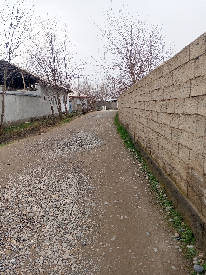 This image depicts a residential street or path in Pichakchi, Uzbekistan, under an overcast sky