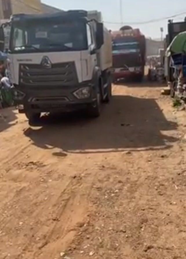 white dump truck driving slowly down a dirt road in what appears to be a market area. There is another, red dump truck further down the road. People and market stalls are visible on both sides of the road. The sky is clear and the sun is shining.