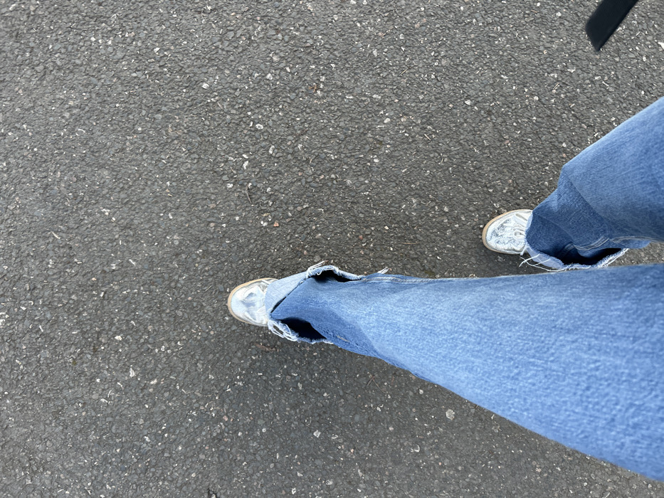 The image displays a top-down view of the lower legs and feet of an individual on a dark grey asphalt surface. The individual is wearing blue denim jeans, characterized by a lighter wash and visible fraying or distressing around the hems of both pant legs. The left pant leg appears slightly more advanced and centered in the frame. On the feet are a pair of light-colored, possibly white or light blue-grey, low-top sneakers with visible laces and light-colored soles. The asphalt pavement is granular in texture, featuring numerous small, lighter-colored aggregate particles embedded within the darker matrix. The scene is located in the city of Saint-Étienne, France.