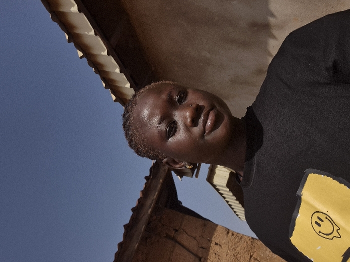 A young Black female is captured in a head-and-shoulders portrait, positioned centrally and looking directly at the camera with a neutral expression. She has short, light-colored hair, dark eyes, a small silver-colored stud in her left nostril, and a small gold-colored hoop earring in her right ear. Her skin exhibits a reflective sheen. She wears a black long-sleeved shirt featuring a yellow graphic on the lower left, which depicts a stylized, melted smiley face. The background reveals a clear, bright blue sky, indicating an outdoor setting. Visible structures include sections of light brown walls, consistent with plaster or mud brick, and two distinct corrugated metal roofs with dark, shadowed eaves, characteristic of simple residential or commercial buildings. The structures appear under direct sunlight, casting distinct shadows. The scene is consistent with an outdoor environment in the city of Yelwa, Nigeria.