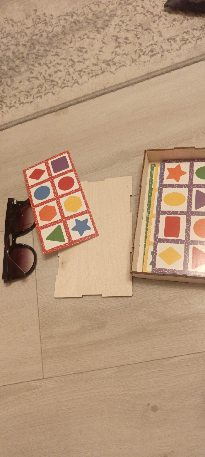 The scene is an interior floor in Марковский, Russia. The floor consists of light-colored wooden laminate planks, with a light-beige, textured rug or carpet partially visible in the upper left quadrant of the frame. On the laminate, a pair of dark-framed sunglasses with dark lenses rests on the far left. Adjacent to the sunglasses, a rectangular card with a red patterned border containing eight white squares, each displaying a distinct colored geometric shape (purple rectangle, red diamond, blue oval, red circle, orange hexagon, green triangle, blue star, and one partially obscured shape), lies flat. This card partially covers a flat, light-toned rectangular wooden piece with cut-out notches along its lower edge. To the right, a light-toned wooden box contains a vertical stack of additional patterned cards. The visible top cards in the box feature purple borders with white squares, each enclosing a different colored geometric shape, including an orange star, green circle, yellow oval, purple diamond, red rectangle, orange hexagon, and purple triangle.