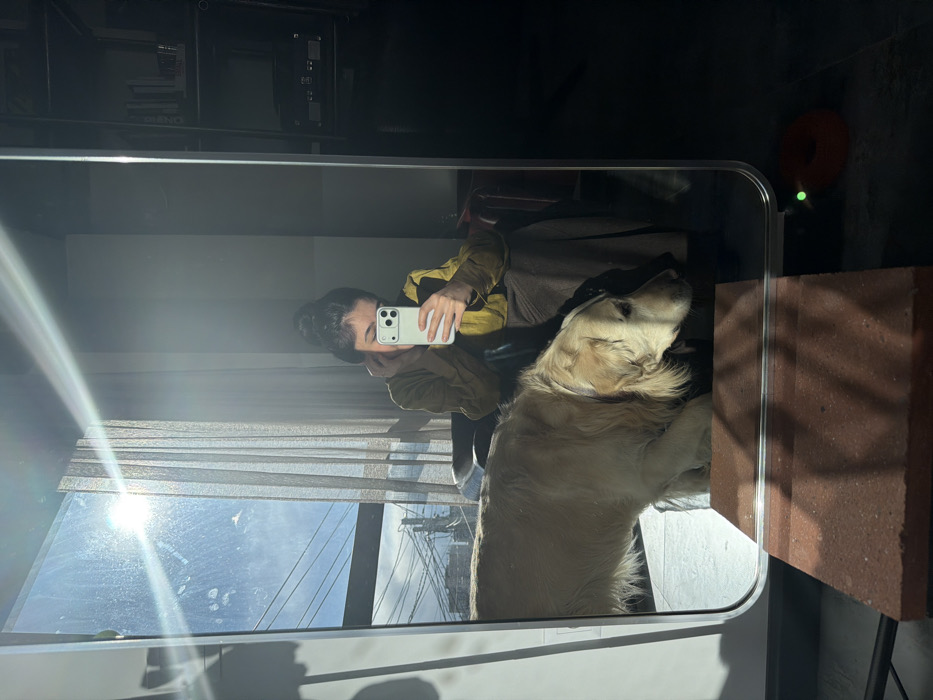 A mirror selfie captures an indoor scene in Zovuni, Armenia. The reflection displays an adult female with dark hair styled in a bun, wearing a yellow-olive long-sleeved top and dark lower garments, seated. She holds a light-colored smartphone with a prominent triple camera array in her right hand, oriented to take the selfie; her left hand is positioned near her face. To her left, a light-colored golden retriever dog is partially visible, its head and upper body illuminated by direct sunlight, appearing to look toward the right. Strong sunlight streams through a window, visible in the reflection, creating a significant lens flare across the mirror and highlighting elements. The reflected outdoor view through the window shows a partially cloudy blue sky, utility poles, and overhead power lines. The room's interior, visible in reflection, includes a dark shelving unit containing books on the right. In the foreground, outside the mirror's reflection, a rectangular reddish-brown brick block rests on a dark floor, casting distinct shadows. An orange, donut-shaped object with a small green indicator light is located on the floor near the base of the mirror, to the right of the brick.