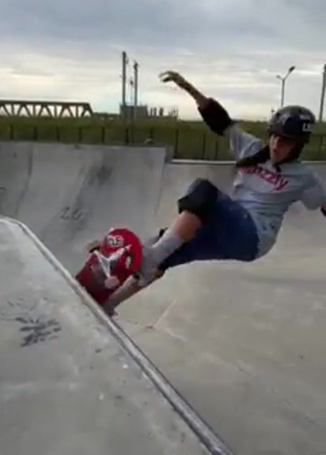 - "A skater wearing a gray shirt, blue shorts, knee pads, and a helmet falls while skating at a concrete skatepark under an overcast sky" by FM-faLbl2, licensed under CC BY 4.0
