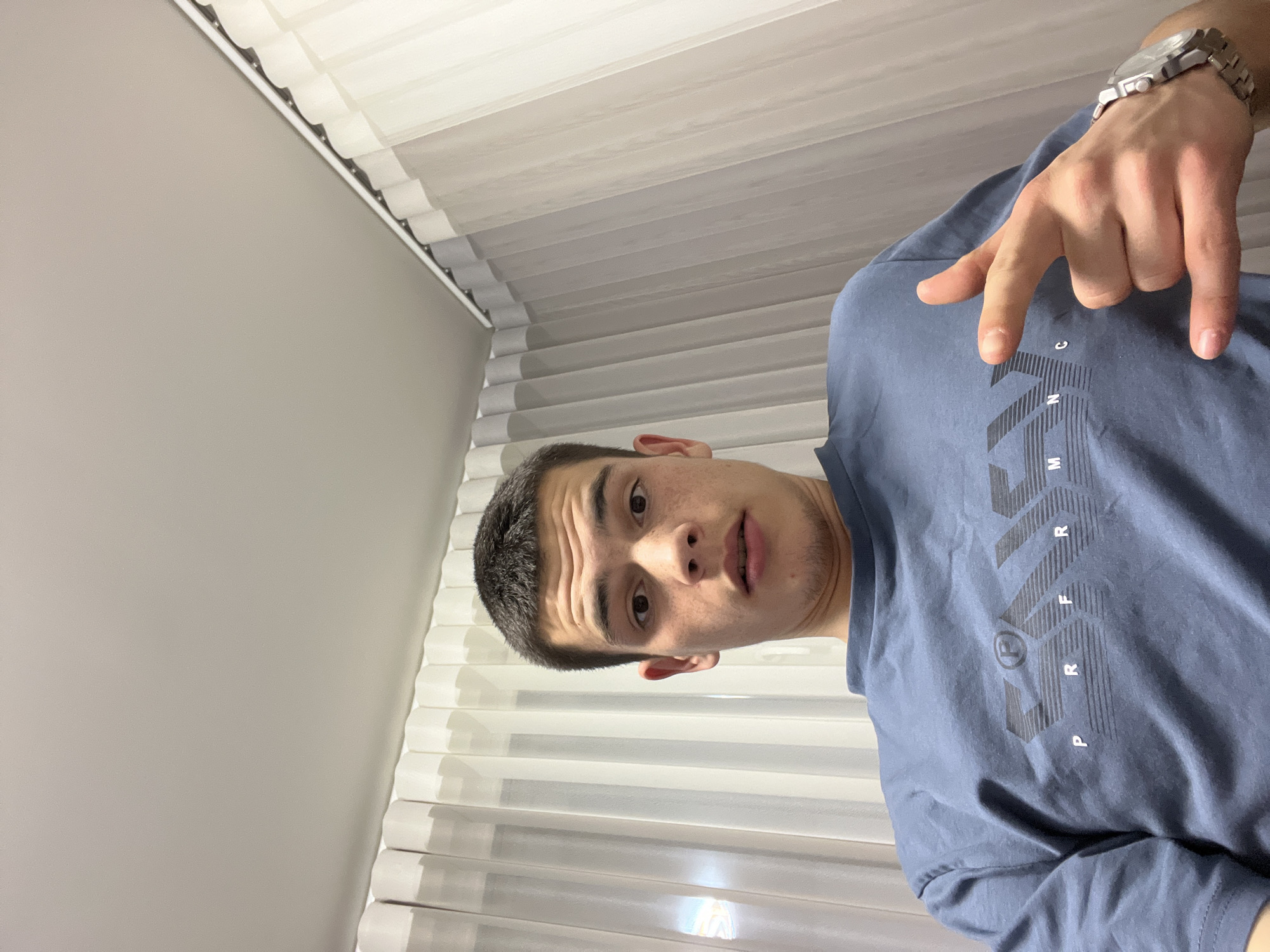 A young adult male, located in Karavelovo, Bulgaria, is depicted in a close-up, low-angle indoor shot