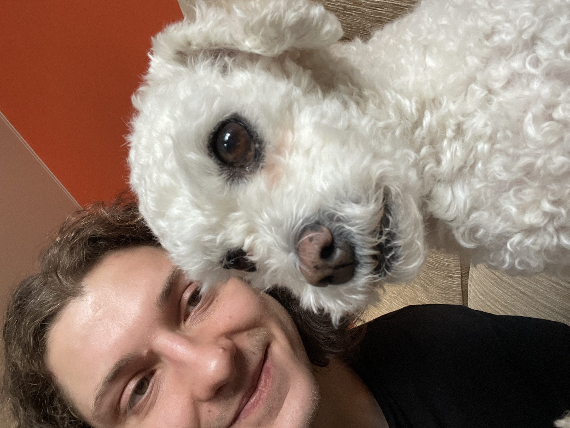 A selfie-style photograph shows a man with long, wavy brown hair smiling into the camera. Above him and slightly to the right is a white, fluffy dog, possibly a Bichon Frise or similar breed, with its head resting near the man's. The dog's nose is close to the camera, and one of its brown eyes is visible. The man is wearing a black shirt. The background includes an orange wall in the upper left and a light brown, possibly wooden, surface in the upper right. There is no evidence to suggest this image was taken in Yekaterinburg, Russia.