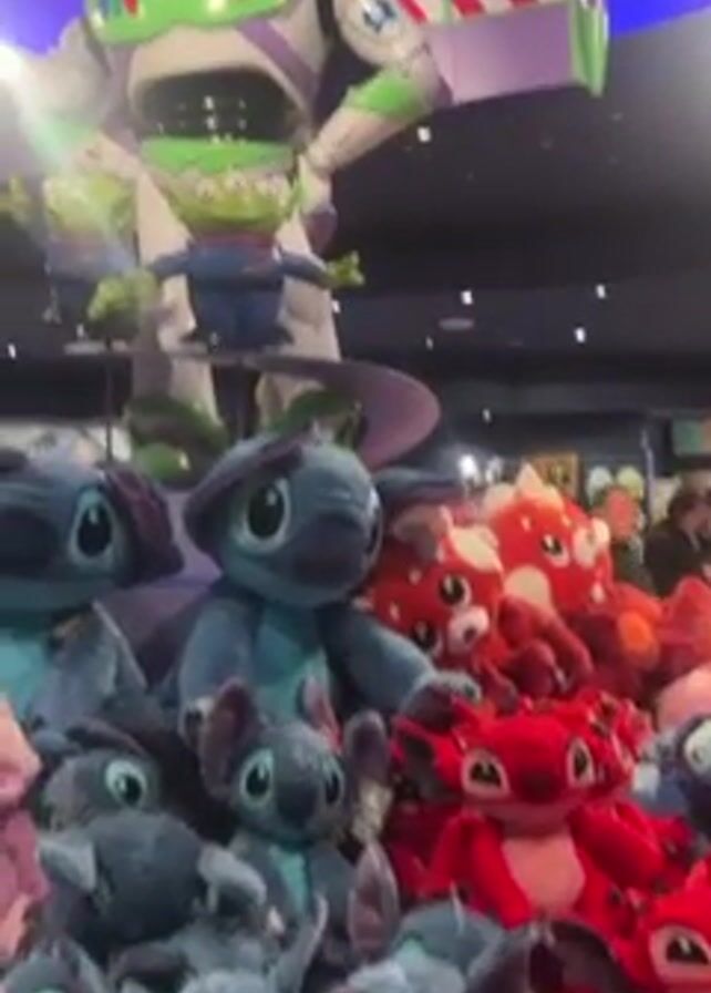 A medium shot shows a section of a store selling Disney character plush toys. Many blue Stitch, red Angel, and red Dinosaur-like plush toys are visible on the lower shelves. Above them are medium-sized alien and Buzz Lightyear figures. The room has a dark ceiling and light-colored walls. Other shoppers can be seen in the background.
