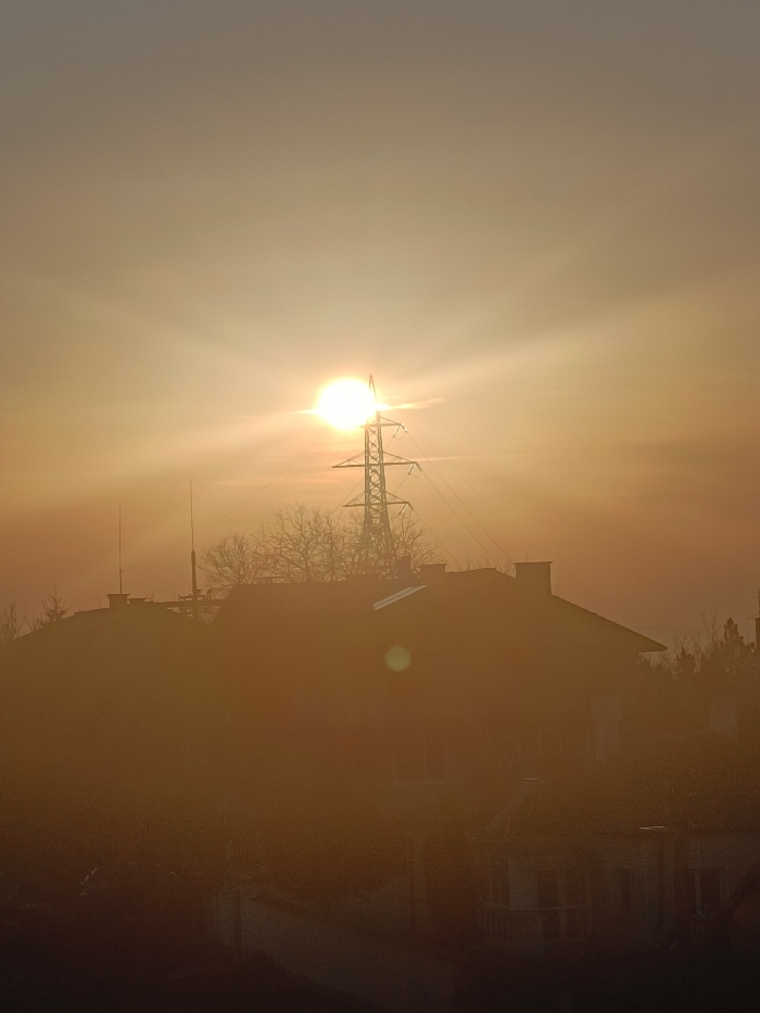 The image displays an outdoor scene in Byala, Bulgaria, under conditions suggestive of sunrise or sunset, characterized by warm, hazy illumination. A prominent, bright circular sun, emitting distinct radial light rays, is positioned in the upper-middle of the frame. The sun is partially obscured by a dark, silhouetted lattice-work power pylon. The sky transitions from a luminous orange-yellow near the horizon to a duller grey-orange in the upper portion. In the lower half of the image, the upper sections of multiple residential buildings, featuring pitched roofs and chimneys, are visible in deep silhouette against the brighter background. Bare deciduous trees are discernible as dark forms situated behind and between these structures. A distinct circular, bright green-white lens flare is present in the lower-middle-left quadrant of the image. No individuals are visible within the scene.