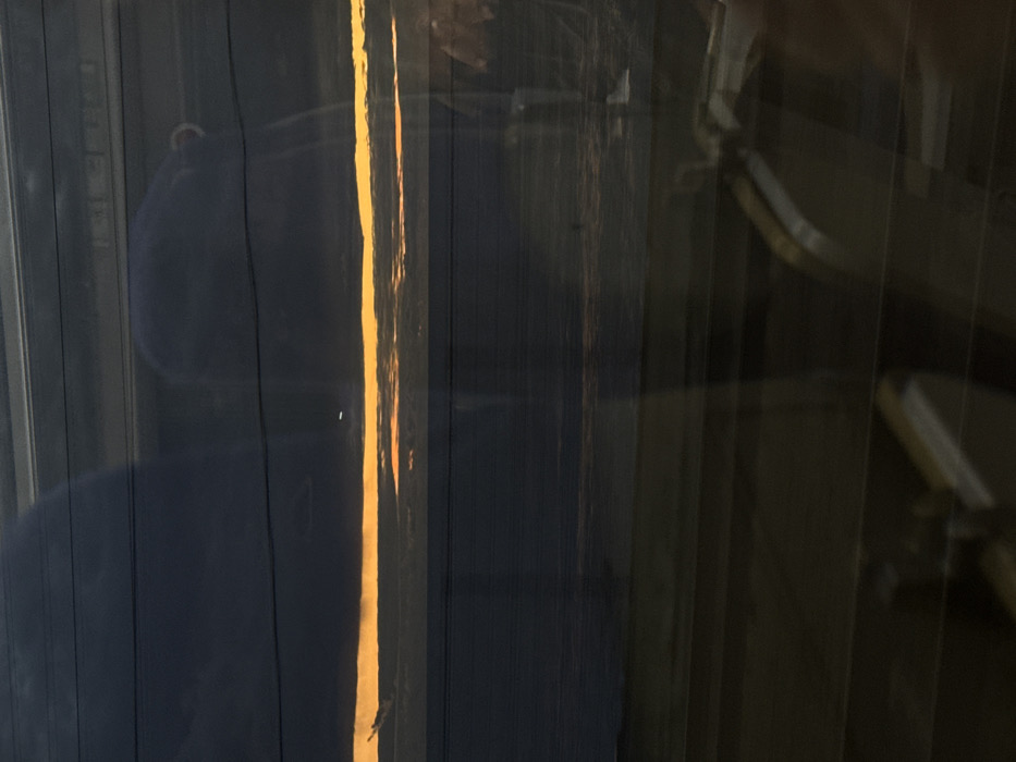 This image displays a sunset over the Black Sea, observed from inside a vehicle, likely a train or bus, in Sochi, Russia. The upper sky is dominated by dark, heavy clouds. A distinct, bright horizontal band of orange and yellow light marks the sunset at the horizon line. Below this radiant band, the dark, textured surface of the Black Sea extends, showing slight ripples. The scene is overlaid with significant reflections on the interior window. These reflections include two dark, amorphous silhouettes, consistent with human heads or upper torsos, positioned in the upper half of the image; the reflection on the right reveals a faint ear-like contour. Multiple horizontal lines, characteristic of window blinds or internal paneling, traverse the entire visual field. In the lower right quadrant, partial reflections of internal seating elements, featuring light-colored trim, are also discernible.