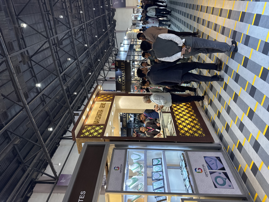 This is an interior view of a bustling exhibition hall located within the Jaipur Municipal Corporation, India. The high ceiling features exposed dark metal trusses, corrugated panels, and numerous circular overhead lights. The floor is covered with a patterned carpet composed of alternating light grey and dark grey rectangular blocks, intersected by diagonal yellow stripes. On the left, a tall white display cabinet for "GEMCRATES" showcases multiple emerald-green gemstone necklaces and pendants on white display forms across several illuminated shelves. The base of this cabinet displays the "GEMCRATES" logo and images of similar green jewelry. Adjacent to the "GEMCRATES" display is the "NAKSHATRA GEMS" booth, constructed with dark wood and featuring illuminated golden geometric lattice panels on its facade. The name "NAKSHATRA GEMS" is prominently displayed in illuminated capital letters at the top. A glass display counter at the front of this booth holds trays of what appear to be small gems or jewelry. Two men in dark suits stand behind this counter, actively engaging with several male customers standing in front of it. One customer in a light blue shirt faces the counter, observing the items. Further into the hall, other exhibition booths are visible, including one labeled "RHK CORALS LLP". A wide carpeted aisle extends into the background, populated by approximately 20-30 individuals, primarily men. In the immediate foreground, with their backs to the camera, stand two men: one in a dark suit, and another in a white shirt and grey vest holding a smartphone with both hands behind his back. Attendees are observed walking, standing, and interacting with staff at various booths, indicating a trade show or fair environment.