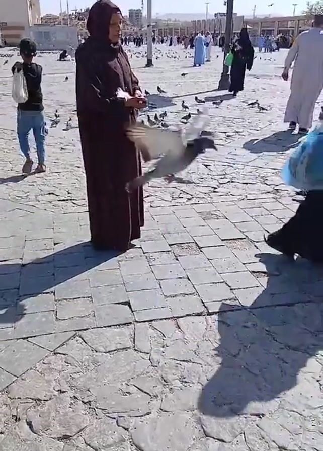 public square with many pigeons on the ground. The square is paved with gray stone. People in different clothing are walking around. A woman in a maroon headscarf and long dress is standing and holding something in her hand, possibly feeding the pigeons. A child with a white bag is standing to her left. Another woman dressed in black walks past the first woman. The background shows a building in the distance and a clear blue sky. Some trees are also visible. The pigeons are scattered across the square, some flying. The light suggests it is daytime.