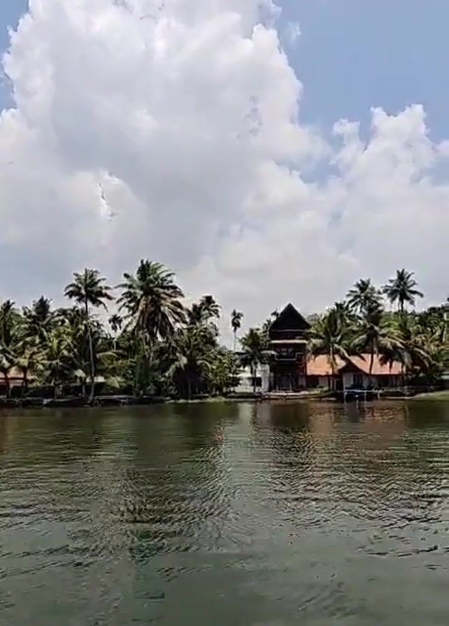 The camera travels across the surface of a body of water, revealing a tropical shoreline with several buildings nestled among lush palm trees. The structures vary in style, with one appearing more modern and elevated, while others seem to be traditional single-story houses with red-tiled roofs. The water is calm with slight ripples, reflecting the surrounding scenery. A bright sky dotted with fluffy white clouds serves as a backdrop, creating a serene atmosphere. The overall scene suggests a peaceful waterfront community in a tropical location.