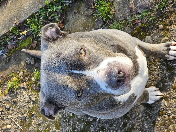- "An American Bully-type dog, exhibiting a blue-gray coat with white markings on its face (a blaze extending between the eyes), chest, and paws, sits on a patch of uneven ground" by FM-n22Rc2, licensed under CC BY 4.0