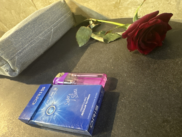 A still-life composition, located in Al-Muhajerin Municipality, Syria, depicts several items arranged on a dark, textured surface. In the upper left quadrant, a light-wash denim fabric object, possibly a rolled piece of clothing or an accessory, is positioned, featuring visible stitching. A single dark red rose with a green stem and several leaves lies horizontally on the surface, extending from the middle-left towards the upper-right. In the lower left quadrant, a sealed blue package of "ORIS Pulse 3 Super J Slims" cigarettes is visible, labeled with "SWITCH ON 4 REGULAR TO FRESH" and "PREMIUM AMERICAN BLEND." Adjacent to and slightly overlapping the cigarette pack is a clear pink and purple disposable lighter. The background behind the denim object and rose stem is a lighter, yellowish-brown textured surface. No human subjects or active interactions are depicted. The scene is illuminated, creating distinct shadows, indicative of an indoor setting.