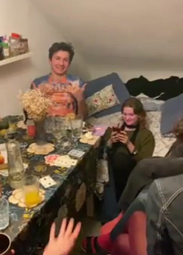 Here's a detailed description of the scene: The scene shows a group of young people gathered in what appears to be an attic or room with a sloped ceiling. A table covered with a patterned tablecloth dominates the foreground. On the table are several glasses, some containing orange juice, along with a vase of dried flowers, bottles, playing cards, and coasters. A young man is sitting at the table, facing the camera and giving a shaka sign with his hand. To his right, a young woman is sitting on what looks like a low couch or cushions, using her phone and smiling at the camera. Other individuals are partially visible, seated or leaning on the couch. The room seems cozy, with a casual and lived-in feel. A small shelf is visible on the left, holding various objects and containers. The overall ambiance suggests a relaxed and informal gathering.
