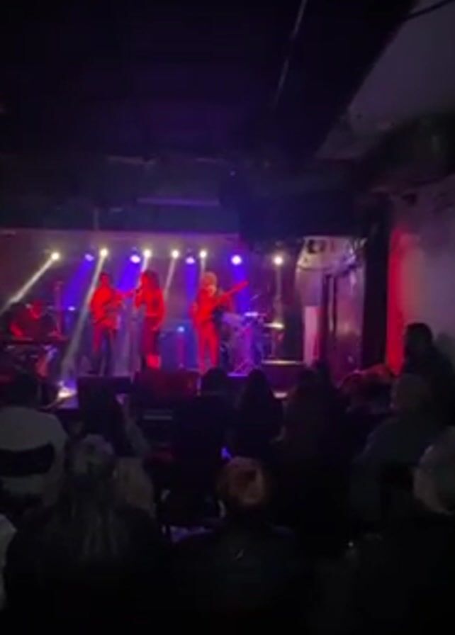 A band is performing on stage in front of a seated audience. The band consists of four members: a female vocalist, a guitarist, a drummer, and a keyboard player. The stage is lit with purple and white lights. The audience is sitting in chairs, watching the performance. Someone is holding a phone up to record the band. The room is dark and appears to be a small music venue.