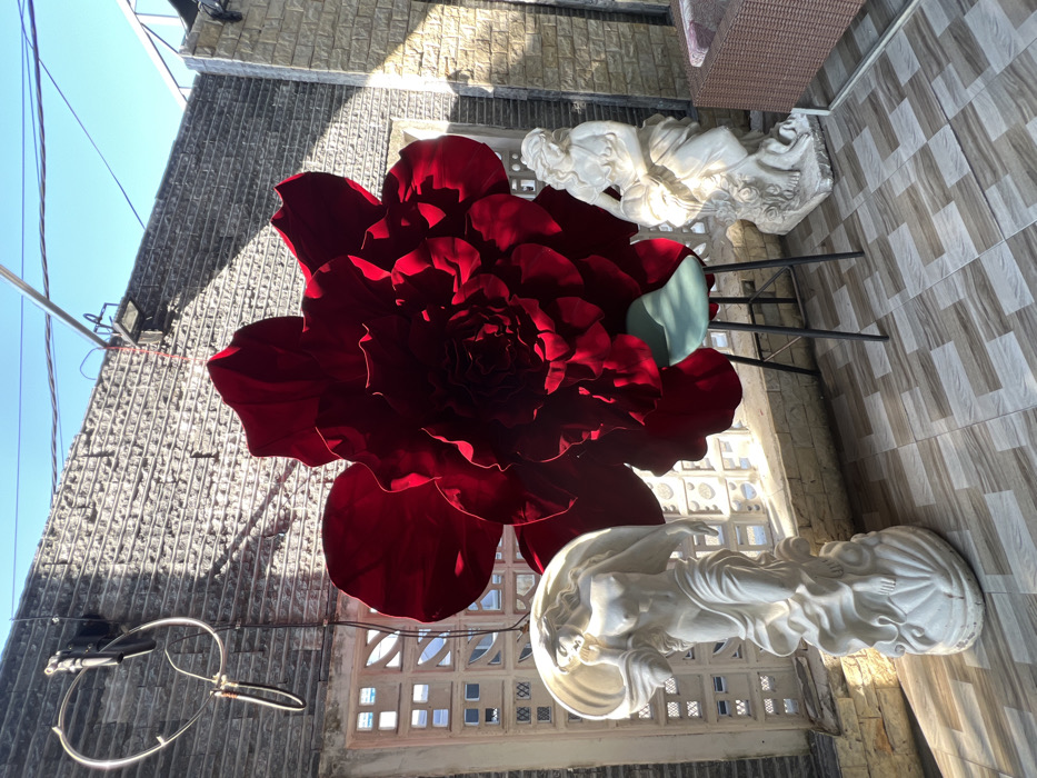 The image depicts an outdoor decorative area in Cam Đức, Vietnam, under direct sunlight, indicated by sharp shadows. Centrally positioned is a large, artificial dark red flower, resembling a multi-petaled rose or peony, standing upright. A mint green, dark-legged bar stool is placed beneath the flower, slightly to its right. To the left, a white classical-style statue of a female figure, possibly Venus or Aphrodite, emerges from a large seashell, draped in fabric, and wearing a wide-brimmed hat. This statue is brightly illuminated. Behind it, a lower section of a wall features white decorative lattice blocks, above which is a grey concrete block wall. An antenna-like structure and various wires are mounted on this wall section. To the right, a second white classical-style statue portrays a seated or kneeling female figure holding an object in her lap, with floral elements at its base. This statue is partially in shadow. A section of brown wicker outdoor furniture is visible on the far right. The floor is tiled with a light brown and grey geometric pattern. The upper background reveals a clear blue sky and additional overhead wiring and metal structures.