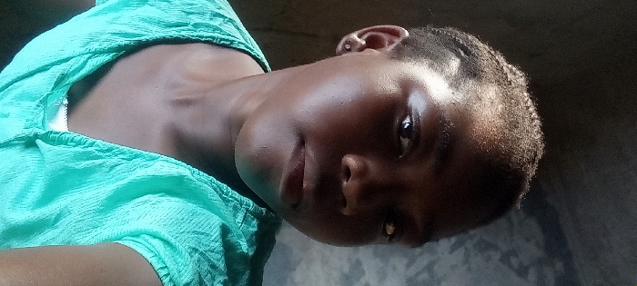 A young, dark-skinned woman with short, braided hair is pictured. She is wearing a light teal-colored blouse. The woman gazes directly at the camera with a slight tilt to her head. The background features a combination of light and dark, possibly indicating a room with varying levels of illumination. Her expression appears calm and subtle.
