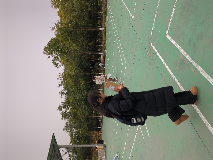 A person in a dark puffer jacket and brown boots walks on a green court with white lines, holding a brown package. Behind them, other people are near trees. A structure with a triangular, possibly solar, panel is in the lower left. The sky is overcast.