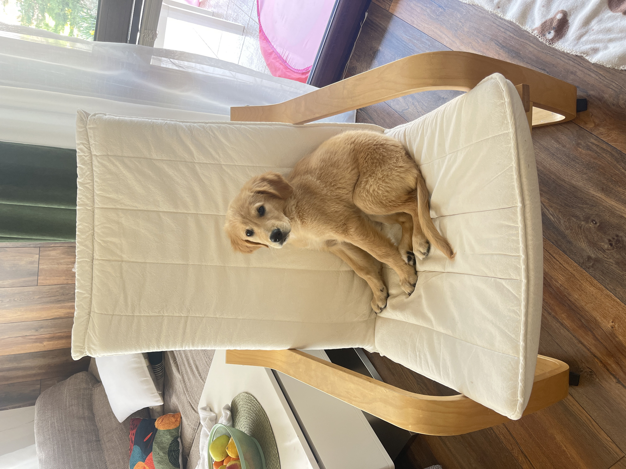 - "A golden retriever puppy is curled up on a white upholstered chair with a light wooden frame" by FM-lpmjW2, licensed under CC BY 4.0