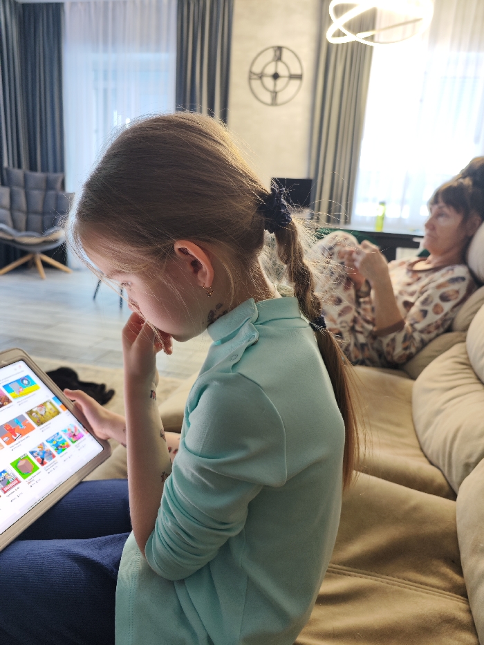 The image portrays an indoor residential living room in Unknown, Unknown. In the foreground, a young girl, approximately 6-10 years old, with light brown hair secured in a low ponytail by a dark blue scrunchie, is seated and angled slightly to the right. She is intently focused on a white tablet held in her hands, which displays a grid of colorful application or video icons. She wears a light blue long-sleeved top with buttons on the left shoulder and dark blue pants. A small gold hoop earring is visible in her left ear, and faint dark markings are present on her neck/jawline and inner left forearm. In the blurred mid-ground to the right, an adult woman with dark hair pulled up is reclining on a beige upholstered sofa, facing generally towards the left. She wears a light-patterned, long-sleeved top. Her knees are bent, and her hands are positioned in her lap area. The room features light-colored flooring and walls. In the background, a grey upholstered armchair with wooden legs is visible on the left. Dark grey curtains overlay sheer white curtains, indicating a window. A large, black, circular wall clock with Roman numerals is mounted on the wall. A modern, white, geometric ceiling light fixture is suspended overhead. A dark table surface with a green bottle is partially visible behind the reclining woman. No direct interaction is evident between the two individuals.