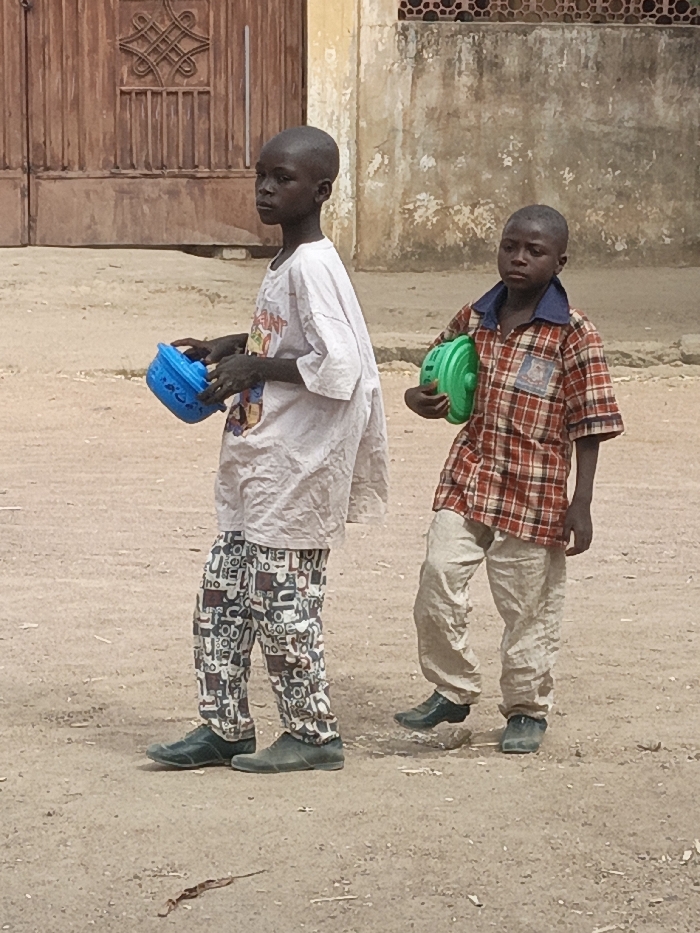 Two children are depicted standing on an unpaved dirt surface in Hotoro South, Nigeria, with building facades in the background. The child on the left, with dark skin and a shaven head, wears a loose-fitting light-colored t-shirt with a partial graphic and trousers patterned with abstract letter-like shapes in brown, black, and white. He holds a blue plastic basket in both hands, angled downwards, and gazes to the viewer's left. The child on the right, also with dark skin and a shaven head, wears a red and white plaid short-sleeved shirt featuring a blue collar and a small patch on the left chest. He wears light beige trousers and carries a green plastic, dome-shaped object under his left arm. This child looks directly forward. Both children wear dark green slip-on shoes. The background shows a large, dark brown wooden door with an ornate geometric carving on the left. To the right of the children is a light-colored, weathered stucco wall with a dark horizontal grate or decorative feature near its top. The ground is dry, light brown earth with scattered small debris.
