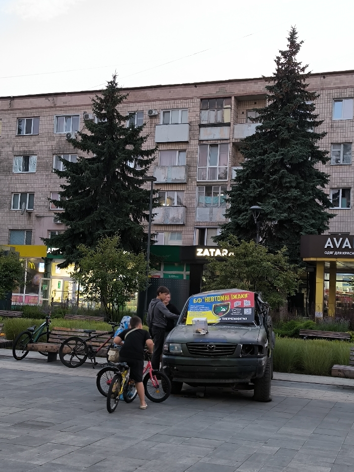 The image displays an outdoor urban scene in Rivne, Ukraine, located near commercial establishments including "ZATARA" and "AVA" stores, and a "McDonald's" outlet, situated at the base of a multi-story residential building. In the mid-ground, a dark-colored utility vehicle or pickup truck, appearing modified or damaged with missing headlights, is stationary on a paved pedestrian area. A prominent banner affixed to its windshield and hood features Ukrainian national colors (yellow and blue), accented with red and black sections. The banner displays Ukrainian text: "БФ "НЕВТОМНІ ЇЖАКИ"" (BF "Tireless Hedgehogs") and "ПЕРЕМОГИ!" (Victory!), along with multiple QR codes and insignia. A clear plastic box is positioned on the truck's hood. Four individuals are present near the truck. A young male in a grey hoodie and dark pants stands to the left of the vehicle, facing its front. Another person is partially obscured behind him. To the immediate left of the truck, a boy in a black t-shirt stands alongside a small pink and yellow bicycle. A fourth individual is partially visible behind this boy. Two additional adult-sized bicycles, one dark green and one black, are propped against a wooden bench positioned to the left of the individuals and the truck. The background consists of a large, multi-story residential building constructed from light pinkish-grey brick or panels, featuring numerous windows and several small, weathered balconies. Two tall evergreen trees are situated between the foreground activity and the background building. The ground is uniformly paved with light gray square tiles. The ambient lighting suggests a daytime setting, possibly late afternoon.