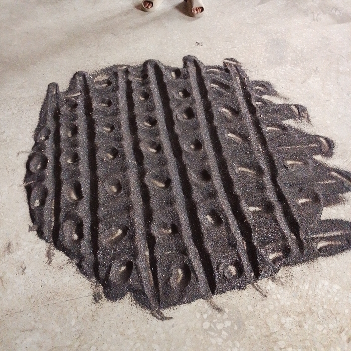 A pattern of dark, granular material lies on a light-colored floor. It is arranged in parallel rows, with evenly spaced circular indentations along each row. The lines are slightly irregular and wavy, with a rough, textured surface. Loose granules surround the main form, appearing as if scattered or worn away. At the top edge of the frame, two feet in sandals are visible, implying a person observing or creating the design.
