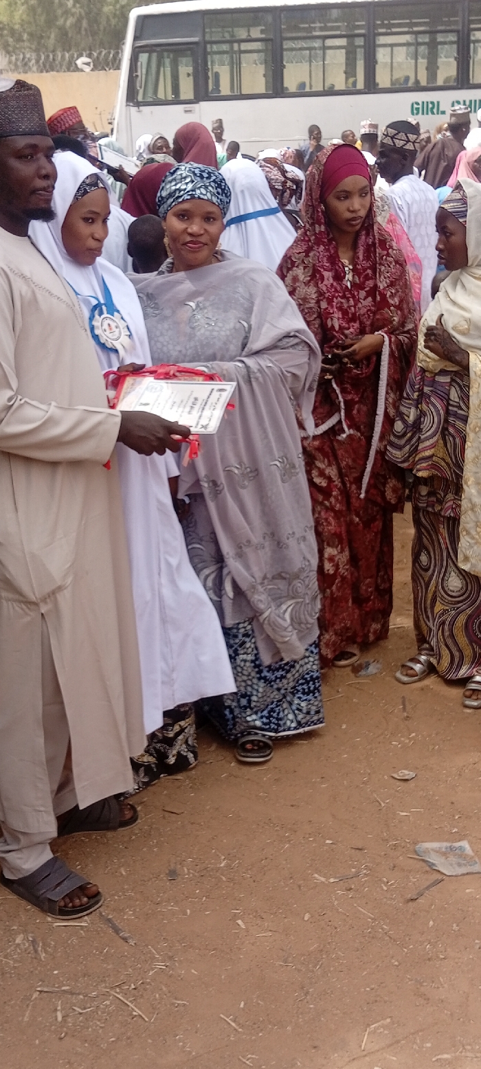 The image captures an outdoor gathering in Sani Mai Nagge, Nigeria, centered around a small group of individuals on a light brown dirt ground. In the foreground left, a man in a light-colored caftan and dark cap holds a white certificate with red ribbons in his left hand. To his immediate right, a woman in a white hijab and dress wears a blue and white decorative ribbon with a medallion around her neck, looking towards the certificate. Adjacent to her, a woman in a grey patterned headscarf and top, worn over a blue patterned skirt, smiles directly at the viewer, her right hand positioned near the certificate. Further right, a woman in a dark red patterned hijab and dress stands, her gaze directed to the right. On the far right, another woman wears a light beige head covering and a patterned dress, displaying visible henna designs on her hands and wearing silver sandals, looking towards the left. The ground is uneven, littered with small sticks and debris. In the background, a white bus with the words "GIRL CHI" (likely "GIRL CHILD") partially visible in green lettering is parked, behind which a crowd of indistinct individuals and structures are present under a bright sky.
