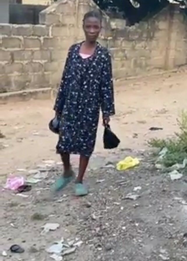 A thin Black girl walks toward the camera on a dirty ground strewn with trash. She is wearing a long-sleeved navy dress with a white floral pattern, mint green slip-on shoes, and carrying a small black bag in each hand. There is a cinder block wall behind her and a tree to her right. A two-story house is visible beyond the wall.