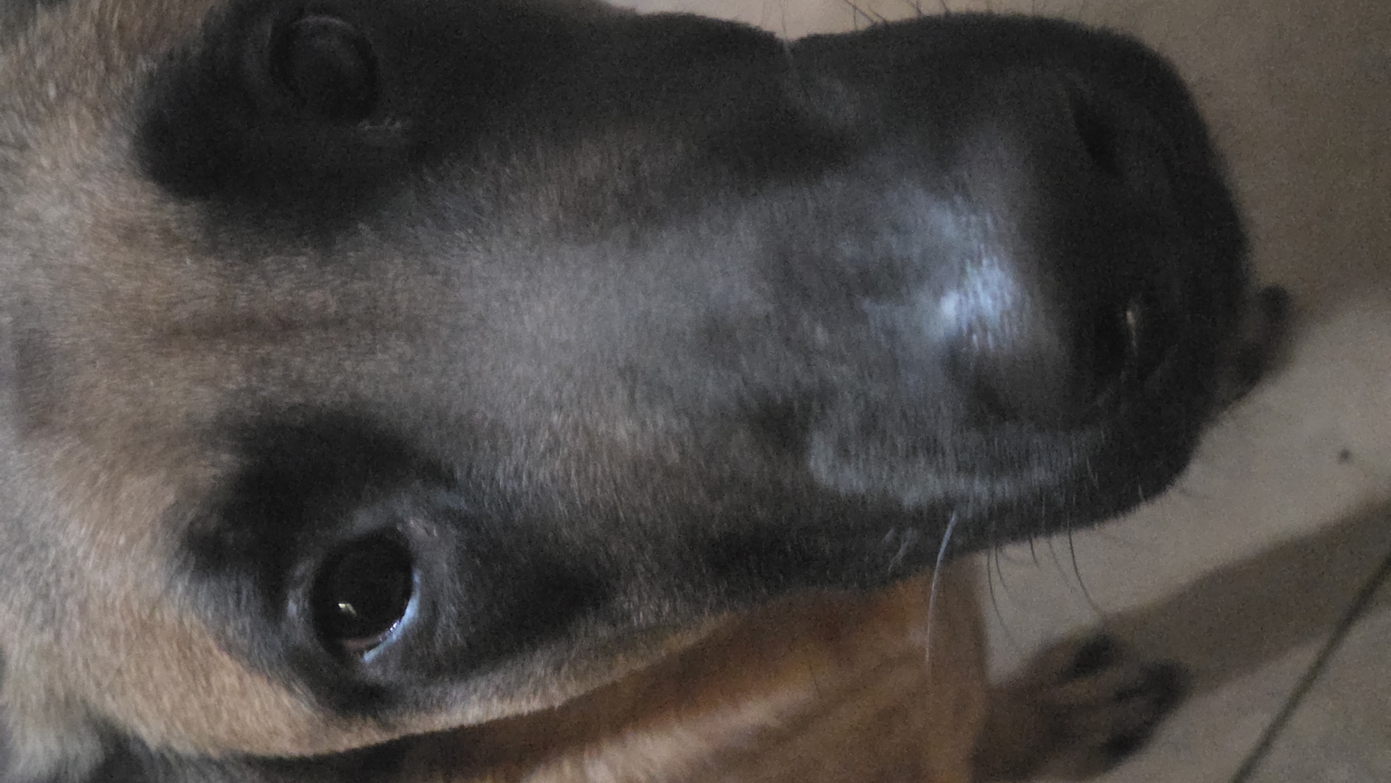 A close-up photograph depicts the frontal facial features of a domestic dog, specifically a canid with a short-haired bi-color coat. The fur on the upper head and sides is tan-brown, transitioning into a dark black mask that covers the eyes and extends down the muzzle to the nose. Both eyes are dark and appear focused directly forward, with a prominent light reflection visible in the left pupil. The nose is black and appears moist. Minimal environmental detail is visible, but indications of light-colored flooring are present in the lower left portion of the image, suggesting an indoor setting within the city of Magny-les-Hameaux, France. No human subjects or discernible objects other than the dog are present.