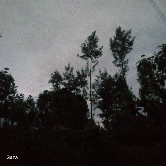 The scene depicts an outdoor landscape under an overcast sky, observed in the vicinity of Gaza. The sky, uniformly grey and heavily clouded, occupies the upper two-thirds of the frame, indicating low light conditions consistent with dusk, dawn, or an extremely overcast day. The lower portion features a dense accumulation of dark, silhouetted trees and foliage. Prominent within this vegetation are several tall, slender trees with sparse canopy, particularly towards the right of center. Denser, lower-growing vegetation forms the foreground and midground. Faint, dark linear elements consistent with overhead utility lines are discernible against the sky in the far upper-left quadrant. No human figures, animals, or artificial structures other than the potential utility lines are present within the observable scene.