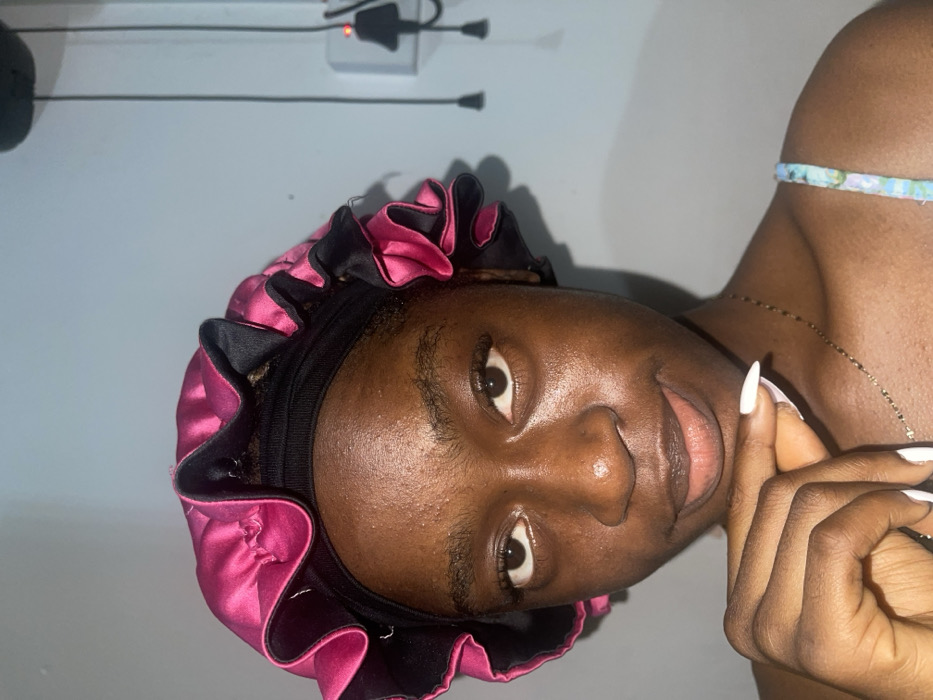 The image displays a young Black female in a close-up, front-facing pose, located indoors in Ado, Nigeria. She is wearing a fuchsia and black ruffled hair bonnet. Her dark eyes are directed towards the viewer, and a subtle smile is present. Her left hand, adorned with white-painted fingernails, is positioned below her chin. A slender gold-colored necklace is visible around her neck, and a light-colored, patterned strap of clothing is visible on her right shoulder. The background consists of a plain light blue-grey wall. In the upper right portion of the frame, a white electrical wall plate with an attached black plug and two descending black electrical cords ending in sockets are visible. A partial dark circular fixture is also present near the top edge of the frame.