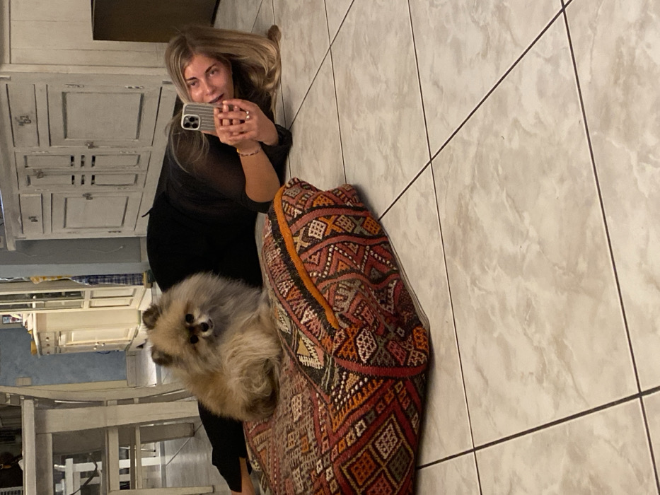 An indoor scene in Wattrelos, France, depicts a female and a dog on a tiled floor. A female, appearing to be a young adult with light blonde hair, lies prone on the light-colored, square-tiled floor, facing the camera. She wears a black long-sleeved top and black trousers. She holds a silver-cased smartphone with her left hand supporting the bottom and her right hand stabilizing the top, positioned to capture a selfie or video. To her immediate left, a small, fluffy, light brown Pomeranian-type dog sits upright on a large, elaborately patterned cushion. The cushion displays geometric designs primarily in red, orange, and black. The dog faces the camera with an alert posture. In the background, out of focus, white wooden dining furniture, including a table and chairs, is visible, along with white wooden cabinetry and a section of a light blue wall.