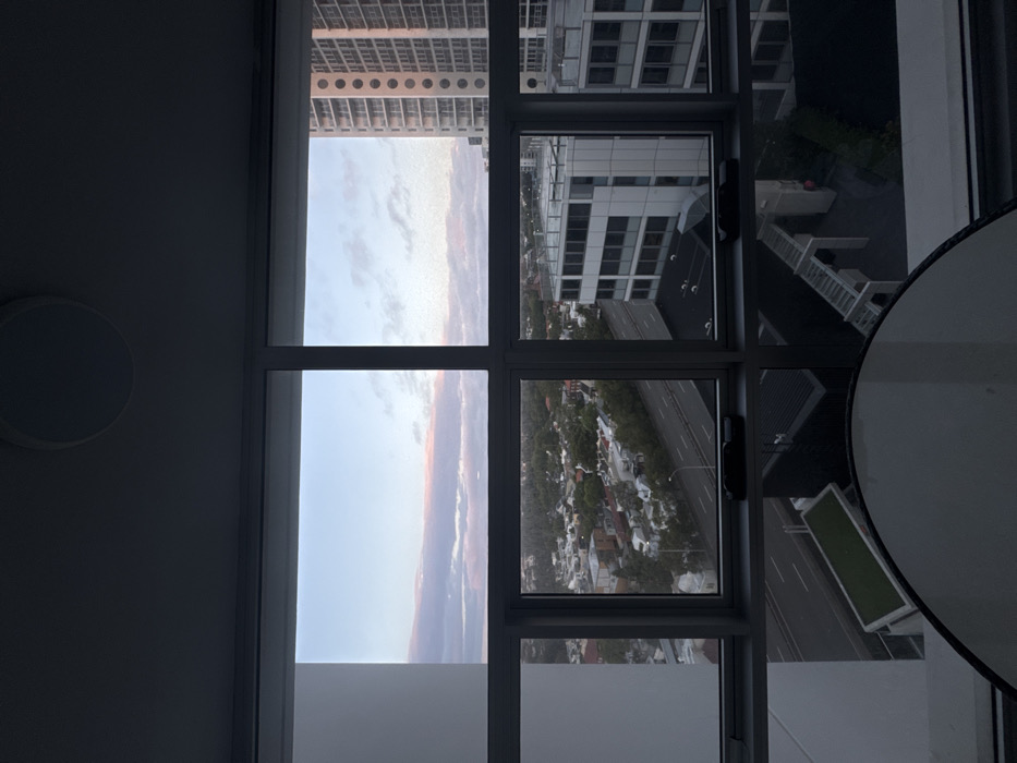 The image presents an exterior view observed through a multi-pane window from an elevated interior vantage point in Bondi Junction, Australia, during either dawn or dusk