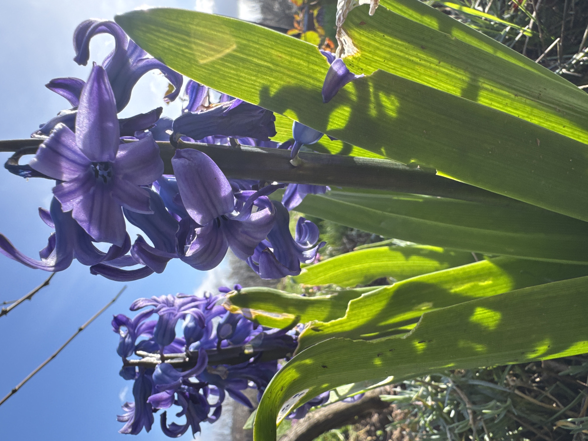 The scene depicts an outdoor garden or natural area in Bardarevo, Bulgaria, observed from a low vantage point under bright sunlight. Two clusters of blooming purple hyacinths are present. The primary subject, prominently in the foreground, consists of vibrant purple hyacinth flowers with multiple florets arranged on a central stalk. Broad, green leaves surround the flowers, displaying visible tears, small perforations, and distinct venation due to strong backlighting from the sun. A second, partially out-of-focus cluster of similar purple hyacinths is situated further back. The upper portion of the frame features a clear, bright blue sky with faint, sparse clouds. Thin, dark, bare tree branches are visible against the sky in the distant background. The ground below the plants comprises dry, sparse ground cover and exposed soil. No human subjects, actions, or specific interactions are depicted.