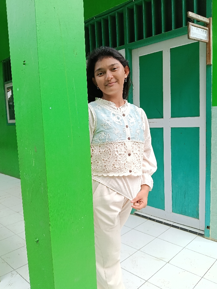 A young woman stands near a green pillar, smiling at the camera. She wears a white blouse with a delicate, lacy, button-down overlay, paired with cream-colored pants. A green door with white trim is behind her. The setting appears to be a building exterior, evidenced by tiled flooring and a partially visible window on the left. A sign hangs above the door frame.