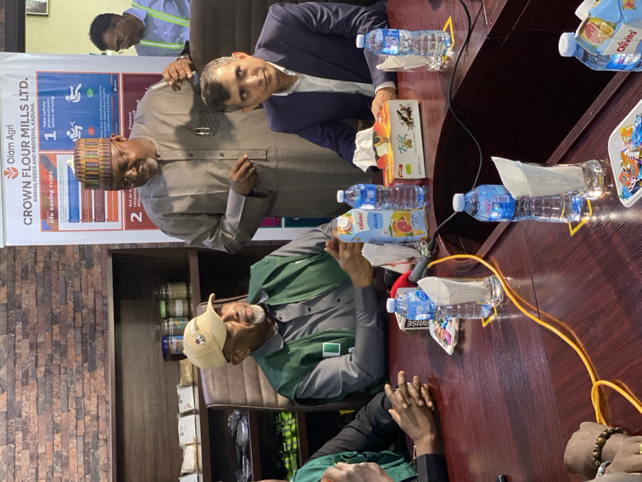 The scene depicts an indoor meeting occurring at Crown Flour Mills Ltd. in Gwagwada, Kaduna, Nigeria. Five adult males are visible. A Nigerian man, standing center-right, wears a light brown traditional garment and a patterned cap, holding a light-colored object and appearing to speak. Seated opposite him at a large, dark brown polished wooden conference table is another Nigerian man, wearing a beige baseball cap, grey shirt, and green vest, with his hands clasped on the table. To the right, an Indian or South Asian man in a dark blue suit jacket and white shirt sits with his hands resting on the table. Partially visible on the far left are the arms of a fourth individual, and in the background right, another man in a light blue shirt and yellow or lime green reflective vest is present. The table holds multiple plastic bottles of water, cartons of "Chivita Active" grapefruit juice, clear drinking glasses, a "Tizzy" brand tissue box, small microphones, and a small white tray containing individually wrapped candies. A bright yellow cable runs across the tabletop. In the background, a white banner prominently displays "Olam Agri CROWN FLOUR MILLS LTD. ANIMAL FEEDS AND PROTEINS, KADUNA," alongside "life saving rules," including safety precautions for driving. To the left, a brick-patterned wall features shelves displaying various transparent jars filled with grains or similar products, and several small white packaged items.