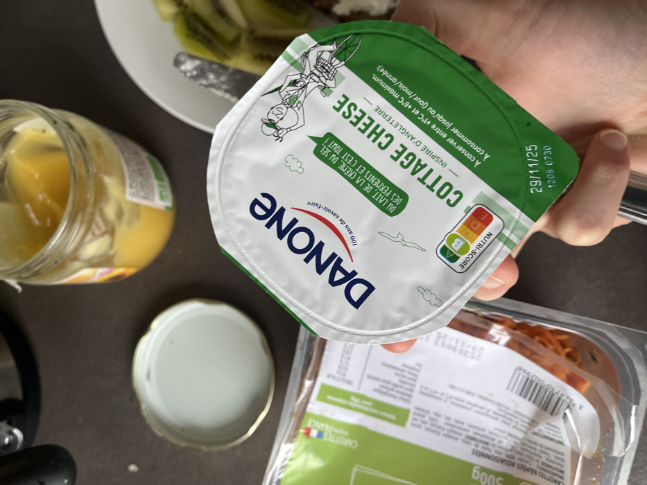 The scene depicts a close-up, elevated view of a dark countertop in what appears to be a kitchen or dining area in Villeneuve-d'Ascq, France. A human right hand, occupying the lower-center of the frame, grips a rectangular white and green plastic container of Danone Cottage Cheese. The container label is primarily in French, displaying "DANONE," "COTTAGE CHEESE," "INSPIRÉ D'ANGLETERRE" (Inspired by England), a Nutri-Score of 'B', and a best-before date of "29/11/25". A cartoon graphic of a man in a bowler hat riding a bicycle is also visible on the label. To the left of the hand, a clear plastic container of pre-packaged "CAROTTES RÂPÉES" (Grated Carrots) weighing "500g" is visible, featuring a French flag symbol on its label. In the upper right quadrant, an open glass jar filled with yellow fruit in syrup, consistent with peaches or apricots, sits next to its detached, light-colored metal lid on the countertop. A portion of a white plate holding several slices of green fruit, identified as kiwi, along with a metallic utensil, is partially visible in the far right background. No other individuals are present.