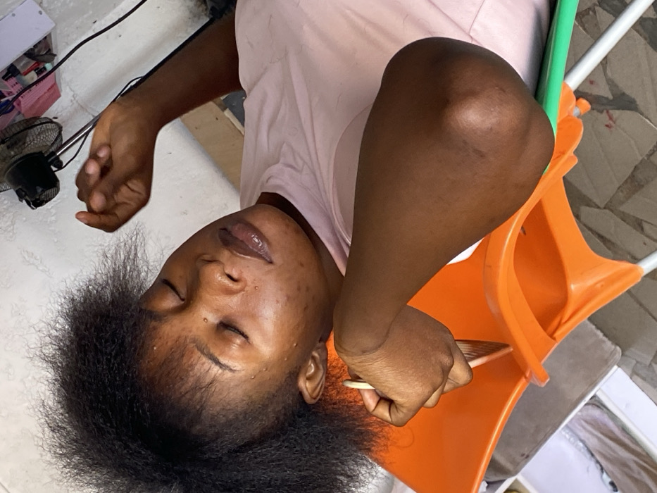 A young adult female, of dark complexion, is depicted in a medium close-up, seated or reclined in a bright orange plastic chair. Her eyes are closed, and her lips appear glossy. Her natural, kinky dark hair is partially styled, with prominent volume at the crown and bangs across the forehead. Minor skin blemishes are visible on her face. She is wearing a light pink short-sleeved t-shirt. Her left hand holds a thin, light-colored hair tool, possibly a parting stick or a comb handle, near her left ear. Her right arm is bent at the elbow, resting on the chair. The background features a light-colored wall. In the upper right quadrant, a black oscillating stand fan is visible. Below the fan, a cluttered shelf or storage area holds various items, including bottles, brushes, and a pink container. The lower frame of the orange chair includes light-colored metal legs with a green accent. The scene takes place in an interior setting, consistent with a salon or personal grooming space, located in the city of Jos, Nigeria.