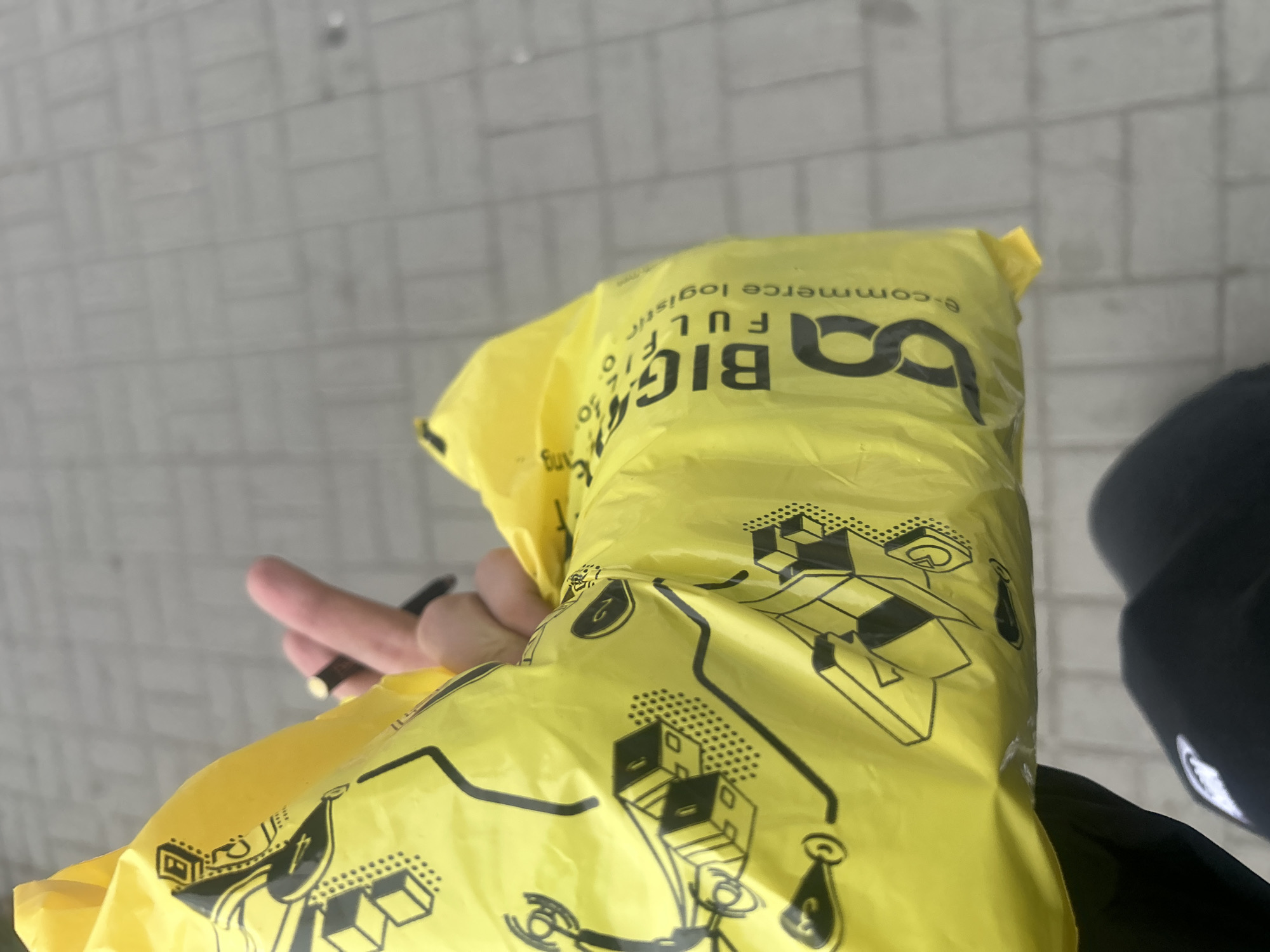 A bright yellow plastic bag, imprinted with the black "BIG FULL e-commerce logistic" logo and black line art depicting abstract urban or logistical network elements, is centrally positioned. A human hand, wearing a gold-colored ring on one finger, grasps the bag. A slender, dark object, consistent with a pen, is held between other fingers. Dark fabric, likely from clothing and a baseball cap, is visible at the bottom of the frame, belonging to the individual holding the bag. The background consists of light gray rectangular paving stones, characteristic of a pedestrian walkway, with some sections appearing damp. The scene occurs outdoors in the city of Sofia, Bulgaria, identified by the branding on the plastic bag, which belongs to a Bulgarian e-commerce logistics company.