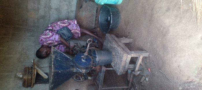 A woman in a patterned dress operates a grinding machine in a rustic setting. A black bowl and a blue bucket sit nearby. The machine is constructed from dark metal and wood, resting on a crude stand. A pulley system is visible on the left, connected to the grinding mechanism. The surrounding environment appears to be a dirt-floored room with rough walls.