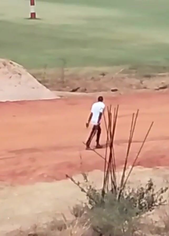 A man dressed in a white shirt and dark pants is walking along a red dirt road. There is a pile of dirt to his left and some sparse vegetation in the foreground. In the background is a green field with two red and white striped markers. A blue piece of machinery is visible to the right of the man. The man appears to be inspecting the ground as he walks.