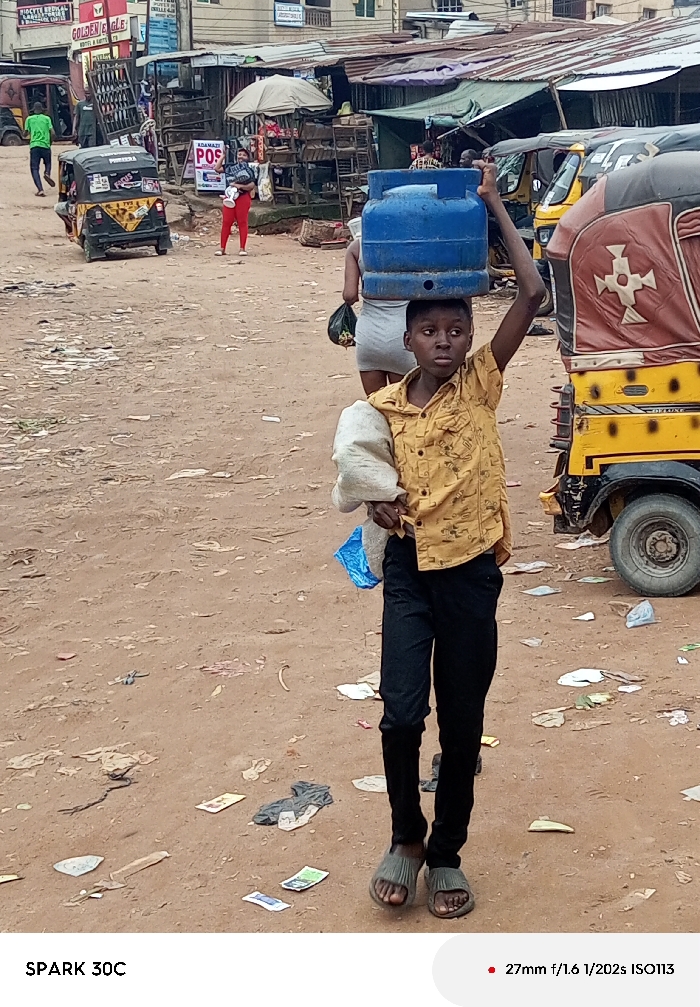 The image depicts a daytime street scene in a market area of Onitsha, Nigeria. The central figure is a young male, likely a pre-teenager, with dark skin, wearing a patterned mustard-yellow short-sleeved button-up shirt, dark blue or black trousers, and grey slip-on sandals. He is facing slightly left of the camera, looking towards the right, and carrying a blue metal gas cylinder horizontally on his head with his left hand raised to steady it. In his right arm, he holds a light-colored, possibly white, sack or bundle, partially obscured by a blue plastic bag. The ground is an unpaved, reddish-brown dirt road, heavily littered with paper, plastic debris, and other detritus. To the immediate right of the central figure, a yellow and brown tricycle (keke Napep) with a white roof cover featuring a stylized cross design is parked or moving slowly. Behind the boy, a woman in a light grey tight-fitting dress carries a black plastic bag in her left hand, walking in the same direction as the boy. In the mid-ground, a dark green tricycle is visible on the left, and further left, a person in a green shirt walks away from the camera. Towards the center-left, another yellow and black tricycle is parked facing away from the camera. A woman in red pants and a dark top is visible near a stall with a white umbrella, holding a light-colored object, possibly a baby, and standing near a red and white sign that reads "ADAMAZI POS." The background features a bustling street with multiple makeshift market stalls under corrugated iron roofs and green tarpaulins. Further back, multi-story buildings are visible, including one with a red and white sign displaying "GOLDEN EAGLE HOTEL & SUITE." The overall environment suggests a busy commercial district.