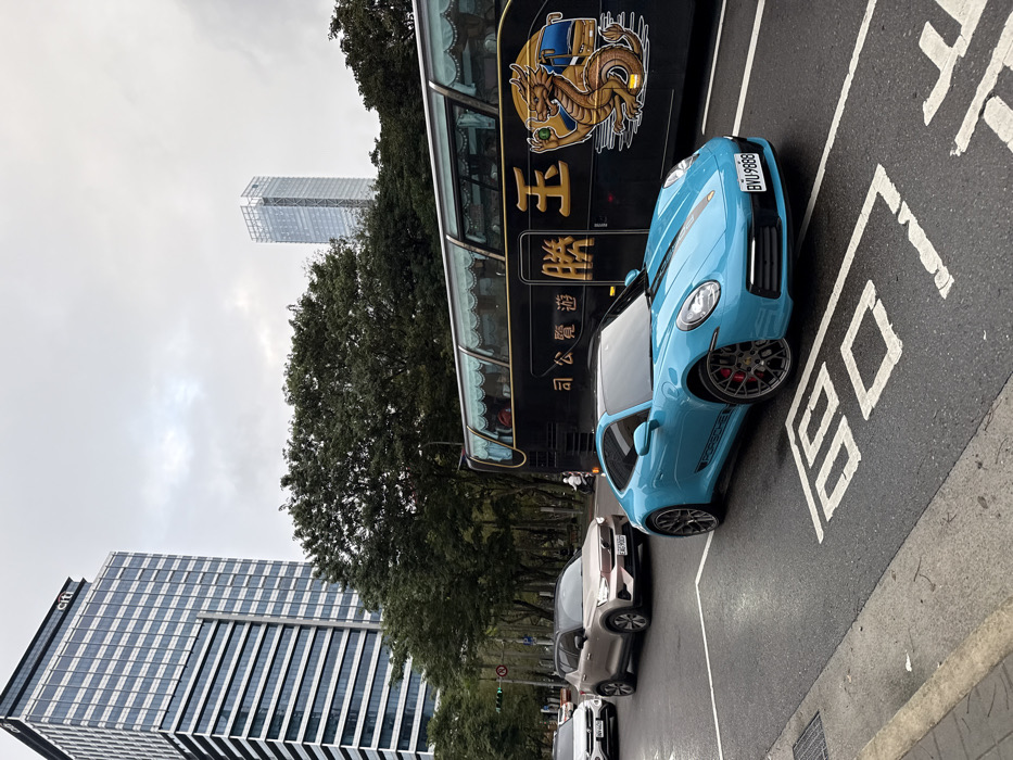 An outdoor daytime scene depicts an urban street in Taipei's Xinyi District under an overcast sky. A prominent bright blue Porsche 911 (992 generation) coupe, featuring a black central stripe and side 'PORSCHE' decals, is positioned in the foreground on an asphalt road marked with partially visible white text. The vehicle displays a license plate of BVU-9888. Adjacent to the Porsche on the right is a black tour bus, decorated with golden Chinese characters reading "玉勝公司旅遊" and a large golden dragon motif holding an orb. Behind the Porsche, a beige and black Volvo XC40 SUV with license plate EAE-9037 is stopped, followed by a partially visible white sedan. A distant scooter operator is visible near the bus. In the background, the multi-story glass facade of the Taipei Nan Shan Plaza, identifiable by the 'Citi' logo on its rooftop, rises on the left. A dense line of green trees separates the street from a park area. Further right and in the background, a slender, taller glass skyscraper, resembling Taipei 101, is partially visible above the tree line. The road surface appears damp.
