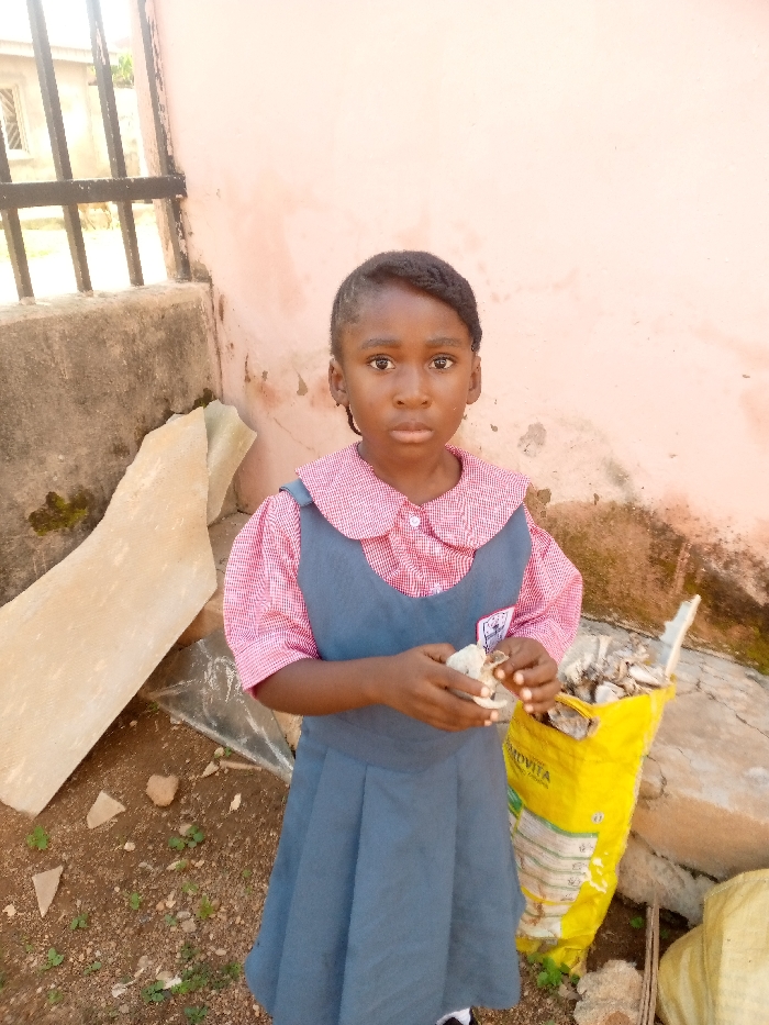 A young Black female child, approximately 6-8 years old, stands outdoors in Sabon Tasha, Nigeria. She faces forward, looking directly at the viewer. She wears a school uniform: a red and white checkered short-sleeved collared shirt beneath a dark gray or blue sleeveless pleated pinafore dress. A white badge with dark insignia is affixed to her left chest. Her hair is braided and styled to the left. In her hands, she holds several small, irregularly shaped, light-colored objects, possibly dried food items or pebbles. The ground around her is bare, reddish-brown earth with scattered small stones and sparse green vegetation. To her left, a large, irregularly shaped, light-colored slab of material rests on the ground. To her right, a yellow polypropylene woven bag, marked with the partial text "GRINDVITA," stands upright and is partially filled with similar light-colored, irregularly shaped items. Another lighter-colored bag is partially visible behind it. The background consists of a weathered concrete wall section topped with a black metal fence, behind which is a light reddish-orange building wall exhibiting discoloration and weathering. A distant building with a window is partially visible above the fence line. The scene is illuminated by natural daylight.