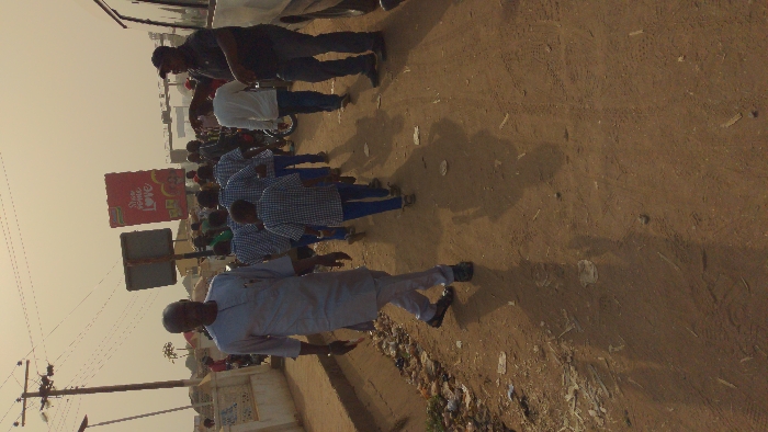The scene depicts a busy, unpaved street in Ado, Nigeria, under a hazy, pale sky. The ground consists of reddish-brown dirt, uneven and scattered with small debris. A concrete curb and shallow drainage ditch, filled with plastic bags and refuse, run along the left side of the path. Long, distinct shadows are cast from the individuals, indicating a low sun angle. In the immediate foreground on the left, an adult male, likely of Nigerian ethnicity, walks towards the left edge of the frame. He wears a light grey traditional tunic (agbada-style top) and matching trousers, with dark shoes. His shadow extends diagonally across the dirt road. In the mid-ground, a group of approximately seven individuals, predominantly children or young students, walk away from the viewer. Most wear blue and white checkered shirts with blue trousers, consistent with school uniforms. To the right in the mid-ground, an adult male stands next to a partially visible white vehicle, possibly a bus or large van. He wears a dark t-shirt, dark jeans, and a dark baseball cap, and is gesturing with his right hand in the direction of the walking group of students. In the background, a wooden utility pole with multiple overhead wires stands on the left. Two advertising billboards are visible; one is red with "Show some Love" text and graphics, while the other is a dark, blank rectangular sign. Further in the background, additional pedestrians and motorcycles are discernible amidst indistinct structures, indicating ongoing street activity.