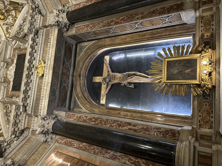 A low-angle shot features a religious display, perhaps an altar piece. A figure of Christ on a cross is prominently displayed inside an arched frame. A painting or icon with a sunburst-like border is to its right. The altar features black and reddish marble. The surrounding walls and ceiling are highly ornate, with intricate carvings and gold accents.