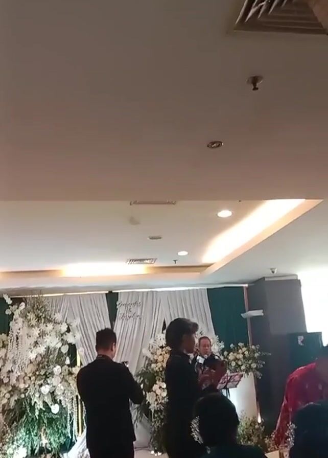 reception in a room decorated with white and green curtains and flower arrangements. A man in a black shirt stands behind a music stand and speaks into a microphone. Another man in a black suit stands to his left, facing the stage and holding what appears to be a phone or camera. Several people sit at tables in the foreground, and a man in a red shirt stands near one of the tables on the right. The room has a white ceiling with recessed lighting and an air vent.
